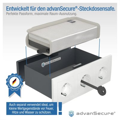 Entwickelt für advanSecure Steckdosen-Tresor: Ideale Passform und maximale Raumausnutzung (19,5 x 9,2 x 4,6 cm) im Zusammenspiel mit unserem Steckdosen-Tresor. Neben Einbruch sind Schäden durch Feuer oder Wasser die größten Risiken für Ihre Werte. Schützen Sie sich rundum!